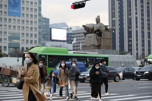 11月29日,行人佩戴口罩在韓國首爾光化門廣場過馬路。