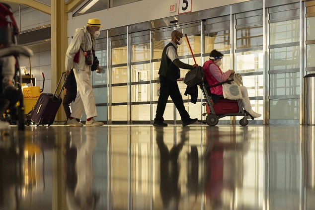 12月4日,在美國(guó)弗吉尼亞州阿靈頓的羅納德·里根華盛頓國(guó)家機(jī)場(chǎng),戴口罩的旅客走在航站樓內(nèi)。