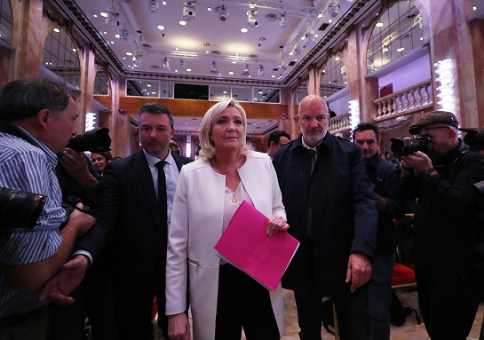 4月13日,法國(guó)極右翼政黨“國(guó)民聯(lián)盟”候選人瑪麗娜·勒龐(前排中)在巴黎出席新聞發(fā)布會(huì),介紹其競(jìng)選綱領(lǐng)的對(duì)外政策部分。