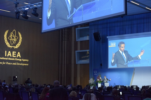 4月25日,國際原子能機(jī)構(gòu)總干事格羅西在奧地利維也納舉行的首屆“核法律:全球辯論”國際大會開幕式上致辭。