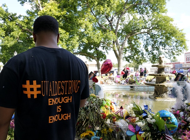 5月31日,在美國得克薩斯州南部尤瓦爾迪市的城市廣場,人們悼念槍擊事件遇害者。