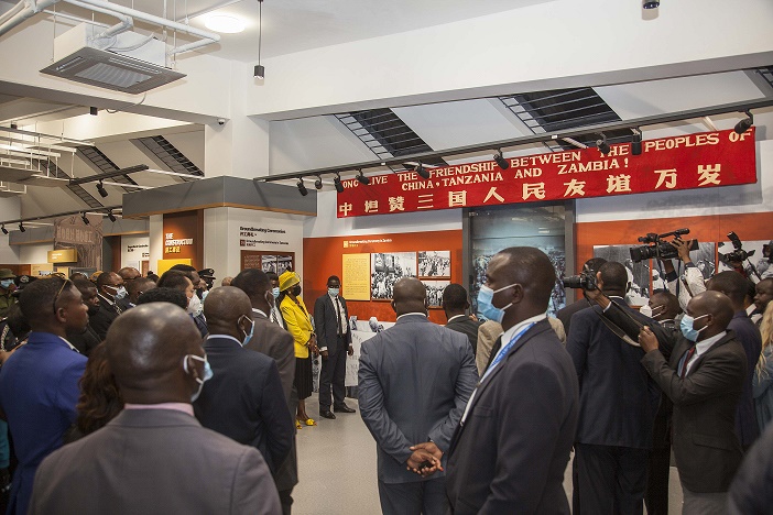 8月10日,在贊比亞盧薩卡省瓊圭地區(qū),來賓參觀坦贊鐵路紀(jì)念園內(nèi)的紀(jì)念館。