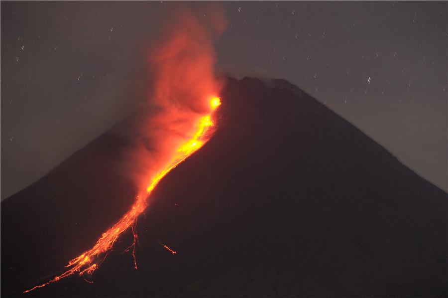 當(dāng)?shù)貢r間2023年3月18日,印尼日惹,默拉皮火山噴發(fā),熔巖流淌。