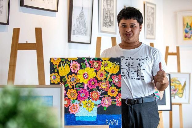 圖為4月2日,在位于曼谷的泰國孤獨(dú)癥職業(yè)中心,一名孤獨(dú)癥患者展示自己的繪畫作品。新華社記者 王騰 攝