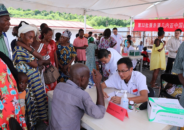 第32批援赤道幾內(nèi)亞中國醫(yī)療隊6月17日在赤道幾內(nèi)亞濱海省科戈市郊區(qū)的巴塔醫(yī)療點舉行義診,為當?shù)鼐用窈椭匈Y企業(yè)員工提供診療服務(wù)。
