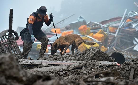 16日,在韓國慶尚北道醴泉郡,救援人員在因暴雨引發(fā)山體滑坡的村莊內(nèi)搜救。新華社/紐西斯通訊社
