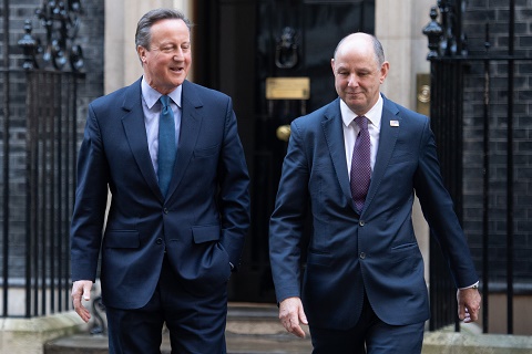 圖為11月13日,在英國倫敦,新任外交大臣戴維·卡梅倫(左)走出唐寧街10號(hào)首相府。新華社發(fā)