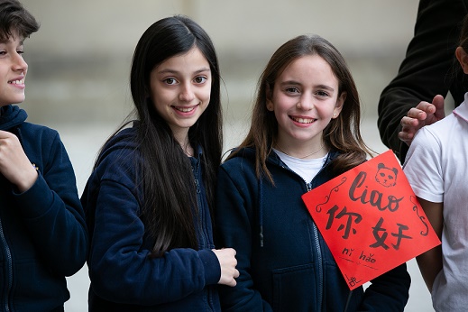 當(dāng)日,在意大利羅馬,羅馬國立住讀學(xué)校學(xué)生展示自己制作的中意雙語標(biāo)語牌。 新華社記者 李京 攝