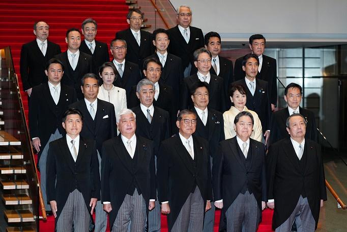 圖為11月11日,日本首相石破茂(前排中)在日本東京的首相官邸率閣僚合影。新華社記者 張笑宇 攝