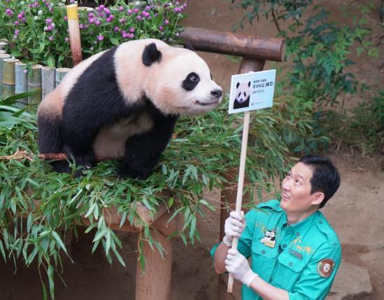 7月7日,在韓國京畿道龍仁市愛寶樂園,大熊貓“睿寶”與飼養(yǎng)員姜哲遠(yuǎn)互動(dòng)。新華社發(fā)(孫一然攝)