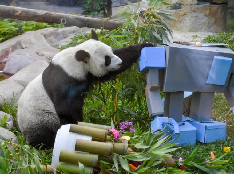 7月30日,在俄羅斯莫斯科動物園,旅俄大熊貓“丁丁”收到生日禮物。
