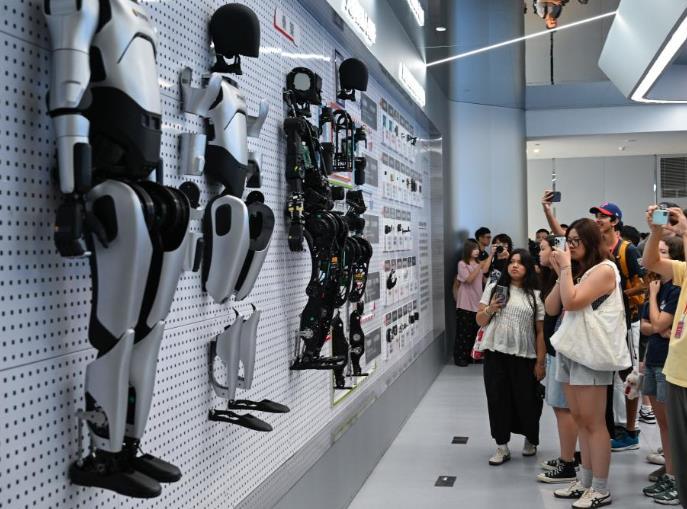 7月29日,美國飛虎隊夏令營代表團成員在湖北省武漢市湖北人形機器人創(chuàng)新中心參觀。