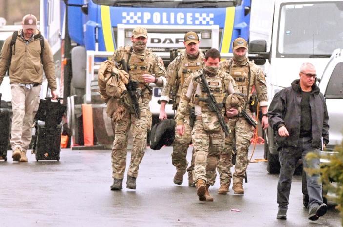 圖為當(dāng)?shù)貢r間2025年8月28日,澳大利亞波爾潘卡,在搜捕一名與警察遭槍手槍殺案有關(guān)的逃犯期間,全副武裝的警察聚集在警務(wù)集結(jié)點。 CFP供圖