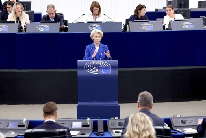 圖為當(dāng)?shù)貢r間10月8日,法國斯特拉斯堡,歐盟委員會主席馮德萊恩在歐洲議會發(fā)言時談及構(gòu)筑“無人機(jī)墻”相關(guān)問題。 CFP供圖
