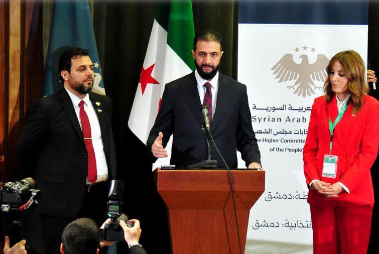 10月5日,在敘利亞首都大馬士革,敘政權(quán)領(lǐng)導(dǎo)人艾哈邁德·沙拉(中)出現(xiàn)在政局劇變后首次立法機(jī)構(gòu)選舉的投票現(xiàn)場。新華社發(fā)(阿馬爾·薩法爾賈拉尼攝)