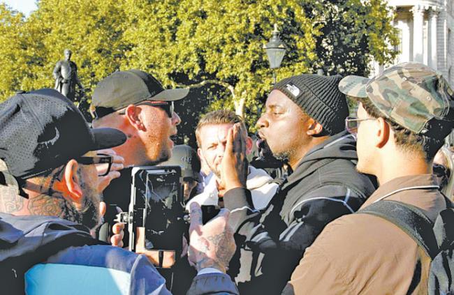 圖為在英國首都倫敦,對移民持不同觀點(diǎn)的人們在抗議活動現(xiàn)場爭辯。 新華社記者 高文成 攝