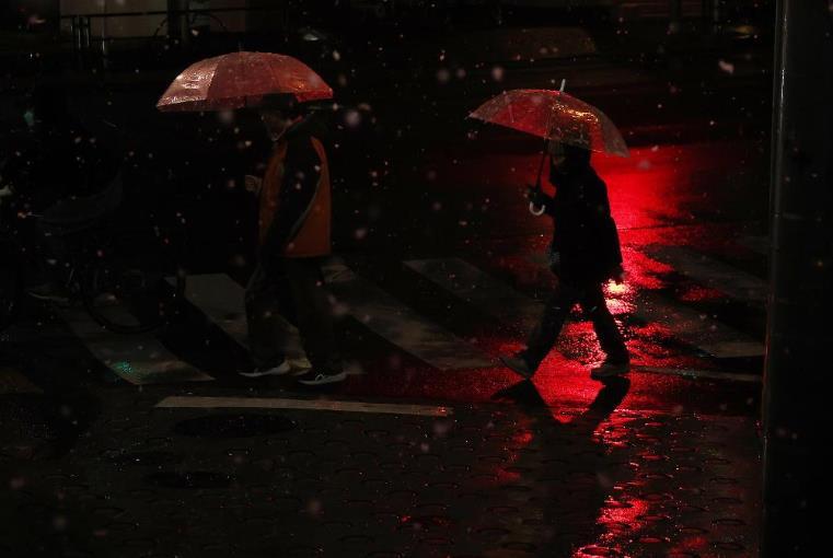 1月2日,行人撐傘走在日本東京街頭。當日,受冷空氣影響,日本東京降下2026年第一場雪。新華社記者賈浩成攝