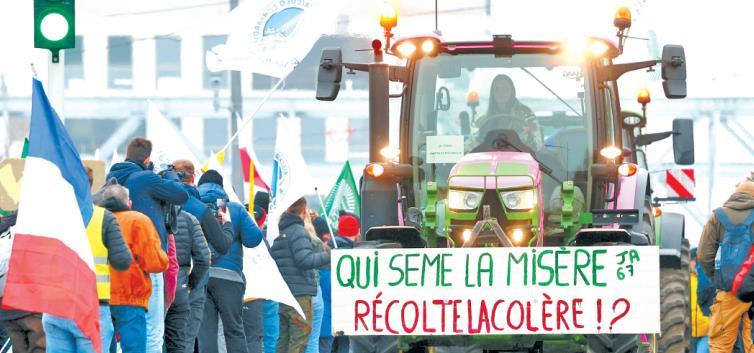 圖為當(dāng)?shù)貢r間1月20日,法國斯特拉斯堡,來自歐洲各地的約5400名農(nóng)民和700輛拖拉機在歐洲議會前示威,抗議簽署歐盟—南共市自貿(mào)協(xié)定。 CFP供圖