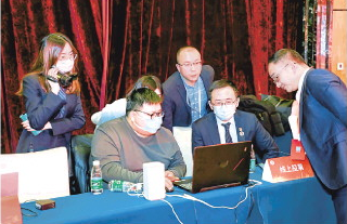 圖為張磊(右二)在上海市期貨同業(yè)公會公證現(xiàn)場監(jiān)督投票結(jié)果。 張江公證處供圖