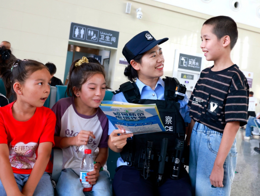 圖為阿克蘇站派出所民警在候車室向青少年開展普法宣傳。武隴慧 攝