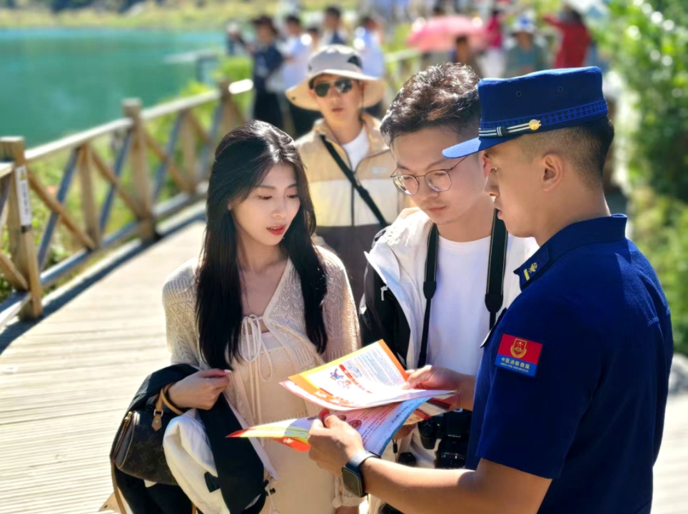 圖為消防人員在景區(qū)向游客們講解消防安全知識。