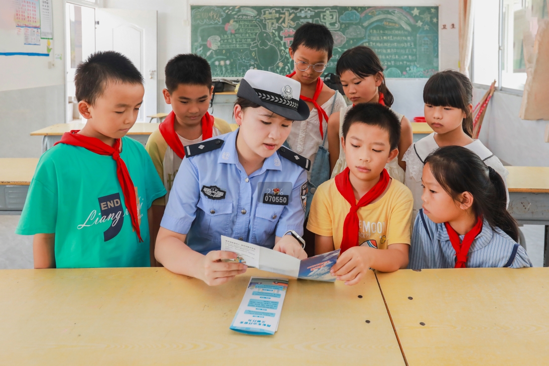 圖為9月2日,民警在章貢區(qū)水西鎮(zhèn)石甫小學(xué)向同學(xué)們講解交通安全知識(shí)。