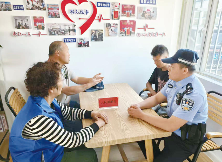 圖為克拉瑪依市公安局克拉瑪依區(qū)分局勝利路街道派出所民警陳城(右一)和人民調(diào)解員彭金梅(左一)調(diào)解鄰里糾紛,促成雙方和解。李滿 攝