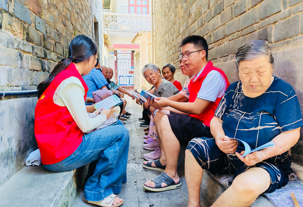 圖為普法志愿者在靖安縣南門社區(qū)巷道內(nèi)向群眾講解反詐知識(shí)。
