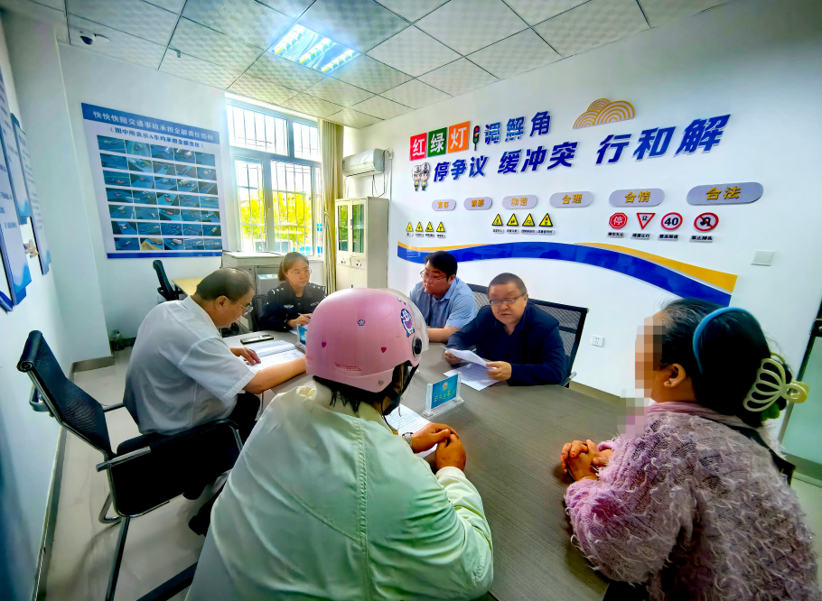 圖為9月11日,在烏蘇市社會治安綜合治理中心“紅綠燈調(diào)解角”,工作人員正聯(lián)動相關(guān)部門共同調(diào)解一起交通事故賠償矛盾糾紛。