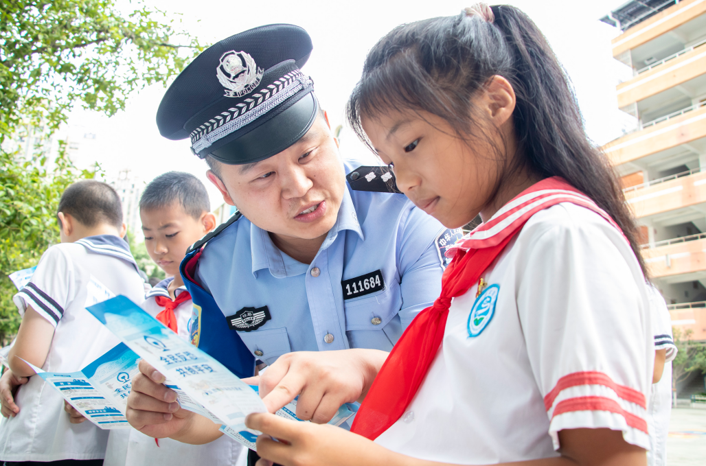 圖為9月12日,在重慶市巫山縣實(shí)驗(yàn)小學(xué)操場,巫山站派出所民警向?qū)W生們普及法律知識。