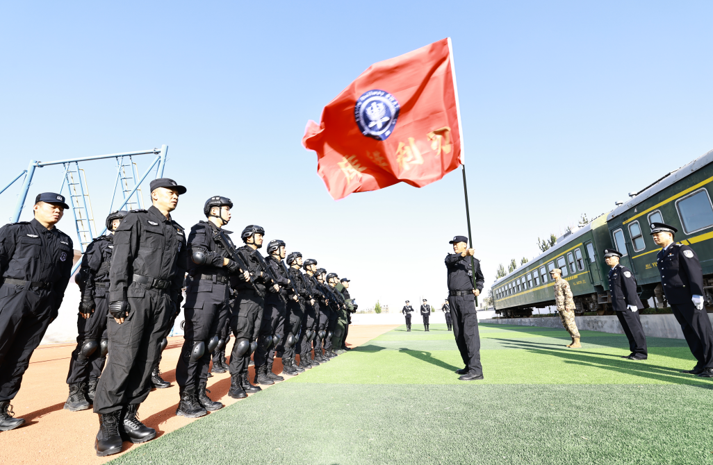 圖為10月10日,烏魯木齊鐵路公安局庫(kù)爾勒公安處特警支隊(duì)授旗儀式現(xiàn)場(chǎng)。