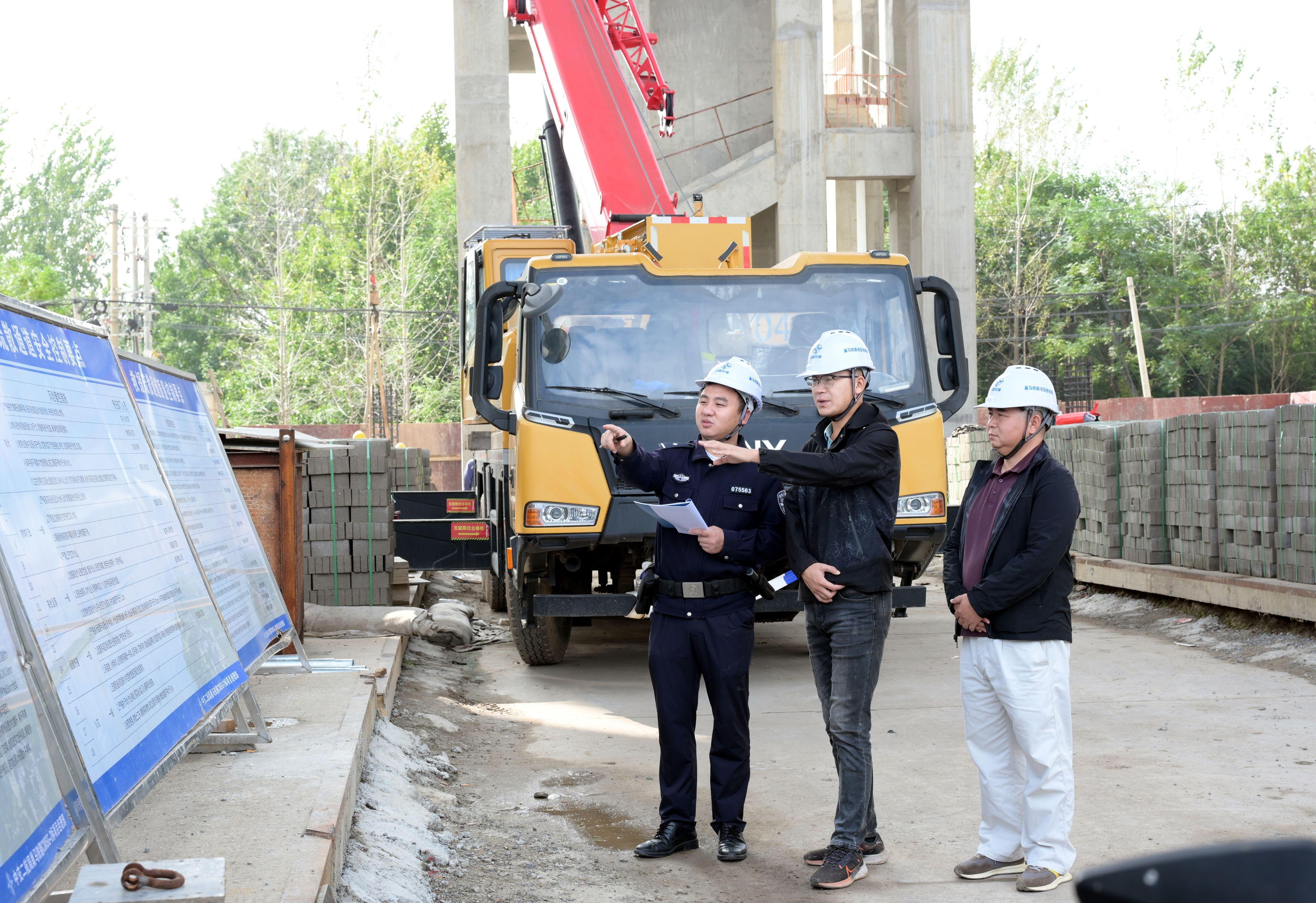 圖為馬鞍山市當(dāng)涂縣公安局江心派出所民警在巢馬鐵路大橋巢馬鐵路CMSG-2標(biāo)項(xiàng)目部進(jìn)行現(xiàn)場(chǎng)指導(dǎo)。