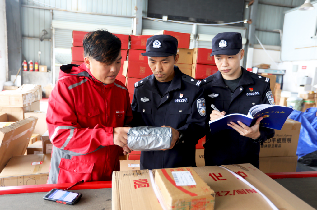 圖為11月3日,民輔警在轄區(qū)寄遞物流企業(yè)開(kāi)展安全檢查。