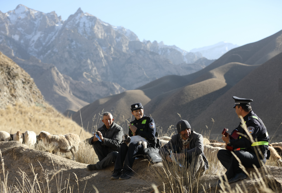 11月14日,新疆維吾爾自治區(qū)葉城縣烏夏巴什鎮(zhèn)牧場(chǎng)褪去秋日斑斕,一年一度的牲畜轉(zhuǎn)場(chǎng)季正式開啟。葉城縣公安局烏夏巴什鎮(zhèn)派出所的民輔警組建護(hù)牧分隊(duì)全程跟隨牧民轉(zhuǎn)場(chǎng),同時(shí)收集牧民的急難愁盼問題,用精準(zhǔn)服務(wù)為轉(zhuǎn)場(chǎng)之路保駕護(hù)航。