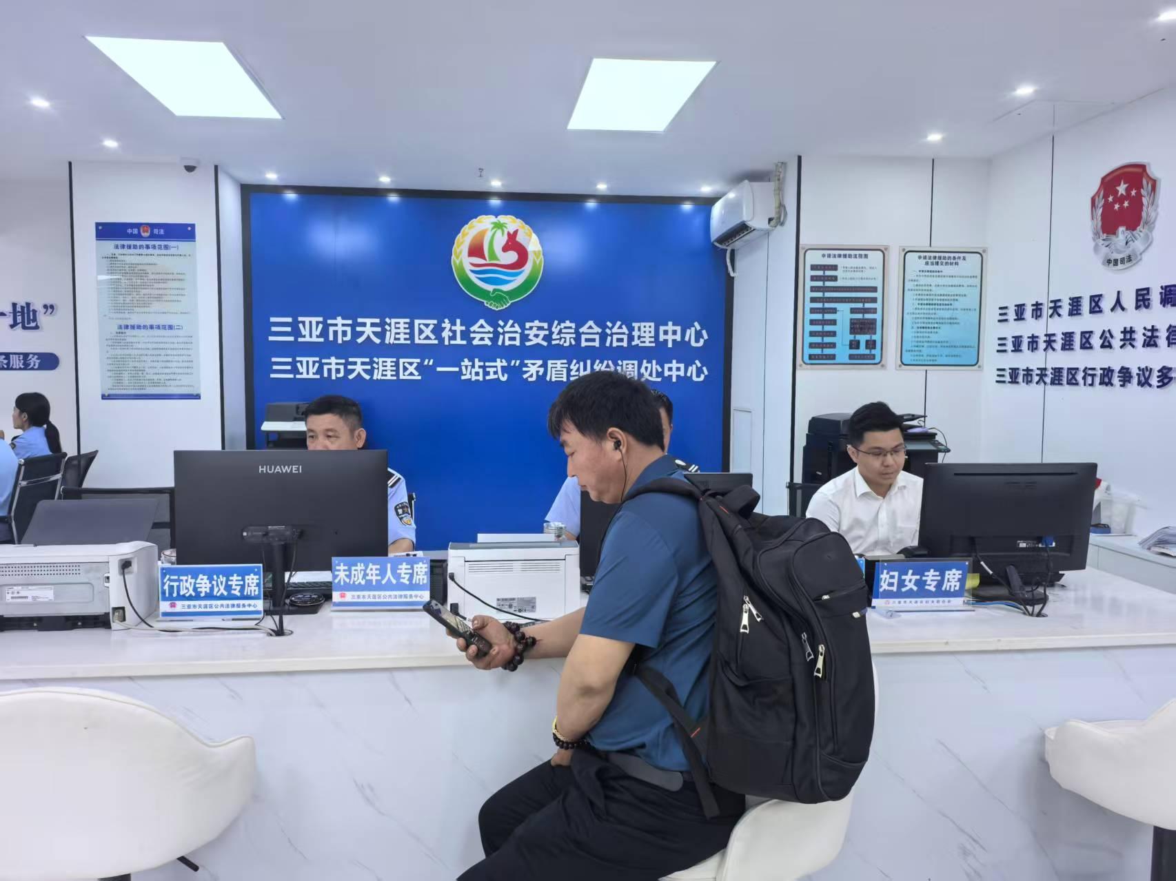 圖為務(wù)工人員到三亞市天涯區(qū)綜治中心咨詢問題。