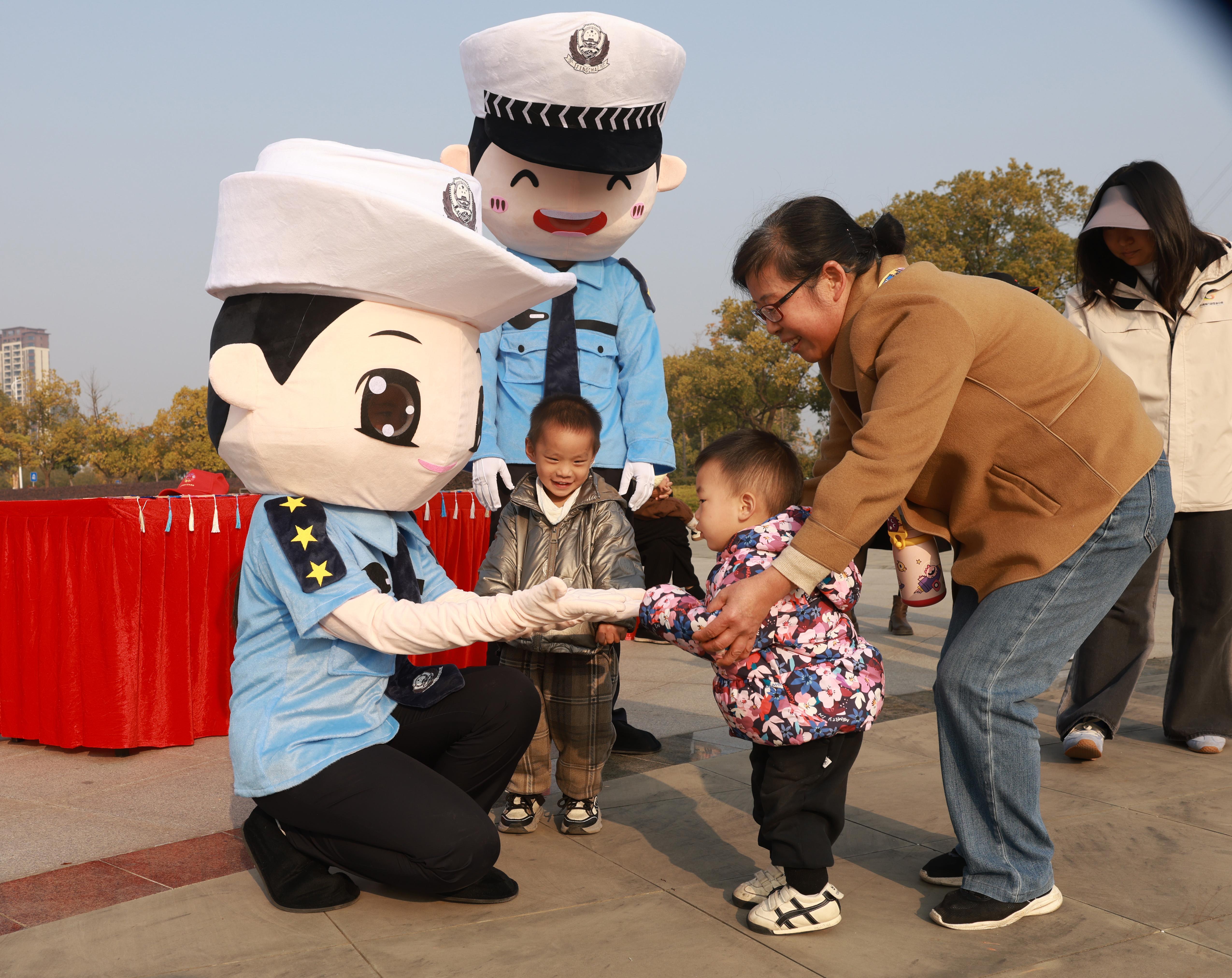 圖為交警玩偶“平平”“安安”與小朋友現(xiàn)場互動。