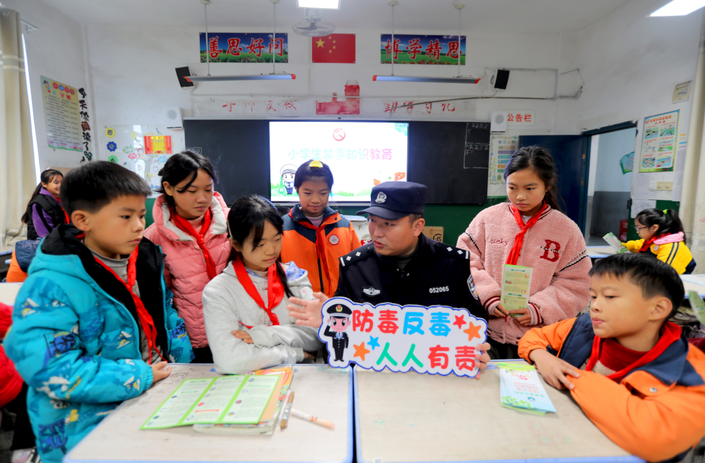 圖為12月24日,民警在楊橋鎮(zhèn)中心學(xué)校向?qū)W生宣傳禁毒知識(shí)。