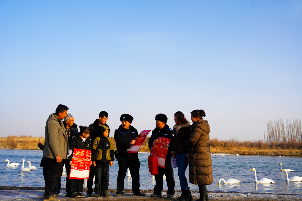 以“生態(tài)警長(zhǎng)制”為抓手,派出所組織民輔警定期與“天鵝志愿服務(wù)隊(duì)”一同開(kāi)展生態(tài)環(huán)境保護(hù)宣傳,引導(dǎo)游客文明觀鳥(niǎo)、遠(yuǎn)離危險(xiǎn)水域。