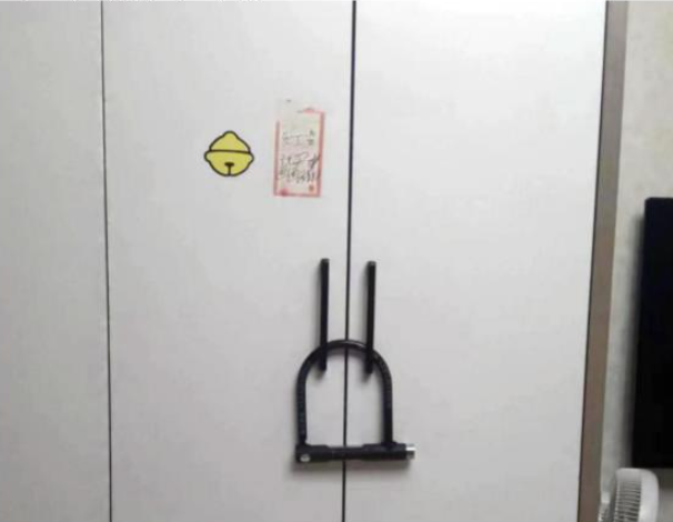 鐘一瑁同學(xué)為了保管好,還把自行車鎖掛在了裝有黃金的衣柜拉手上。