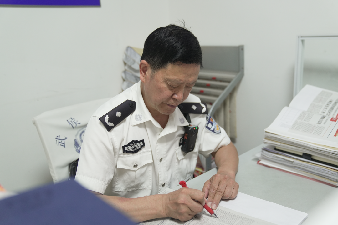 每天早會前,所上的老“國優(yōu)”、社區(qū)警務隊民警郭學彬在辦公桌前翻看工作筆記本,本上認認真真手寫記錄著每日工作、例會內(nèi)容、重點任務、完成情況……他逐頁翻看更新,對照完成進度“銷賬”。