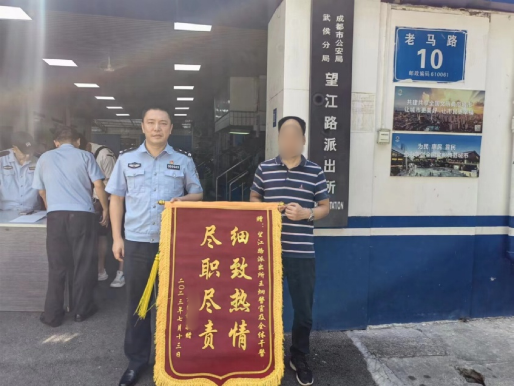 “謝謝警察同志,這么快就幫我把手機找回來了!”近日,方先生將一面印有“細致熱情 盡職盡責(zé)”的錦旗送到了望江路派出所教導(dǎo)員彭偉手中,對派出所民警快速為其追回手機表示誠摯感謝。