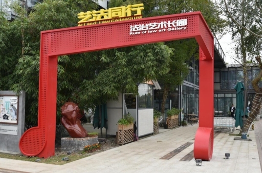 川音藝谷法治文化體驗(yàn)基地位于新都區(qū)石板灘街道韓娥社區(qū),基地以做實(shí)普法體驗(yàn)場(chǎng)景、做強(qiáng)法治藝創(chuàng)產(chǎn)業(yè)、做精藝創(chuàng)法律服務(wù)、做優(yōu)園區(qū)法治化營(yíng)商環(huán)境為抓手,積極探索“守法普法”的新模式?;亻T頭采用二八音樂(lè)符號(hào)藝術(shù)變型設(shè)計(jì),突出普法抓住“關(guān)鍵少數(shù)”。法治雕塑廣場(chǎng)采用經(jīng)典法治故事雕刻作品,展現(xiàn)民法典基本原則理念。法治長(zhǎng)廊采用法治藝術(shù)場(chǎng)景引導(dǎo)+典型案例釋法拓展+交互教育沉浸體驗(yàn)的方式展現(xiàn)熊博士的法治人生。同時(shí),使用四川獨(dú)有物種熊貓,創(chuàng)作形象的熊貓法字LOGO;借鑒新都漢朝說(shuō)唱俑,創(chuàng)作說(shuō)法熊貓吉祥物。與川音藝谷項(xiàng)目的運(yùn)營(yíng)方建立合作機(jī)制,舉辦新都區(qū)法治文化作品展覽、評(píng)選活動(dòng),鼓勵(lì)創(chuàng)作具有法治內(nèi)涵的雕塑、書(shū)法、攝影、音樂(lè)等藝術(shù)產(chǎn)品作品。此外,基地布局川音藝谷法律之家,發(fā)揮社區(qū)法律顧問(wèn)服務(wù)團(tuán)隊(duì)的作用,積極為項(xiàng)目建設(shè)提供合同合法性審查等法律服務(wù),為川音藝谷文創(chuàng)園建設(shè)保駕護(hù)航?;剡€設(shè)立川音藝谷知識(shí)產(chǎn)權(quán)保護(hù)工作站,融合多部門的職能作用,營(yíng)造良好的國(guó)際營(yíng)商環(huán)境,增強(qiáng)藝創(chuàng)產(chǎn)業(yè)創(chuàng)作創(chuàng)新的活力。