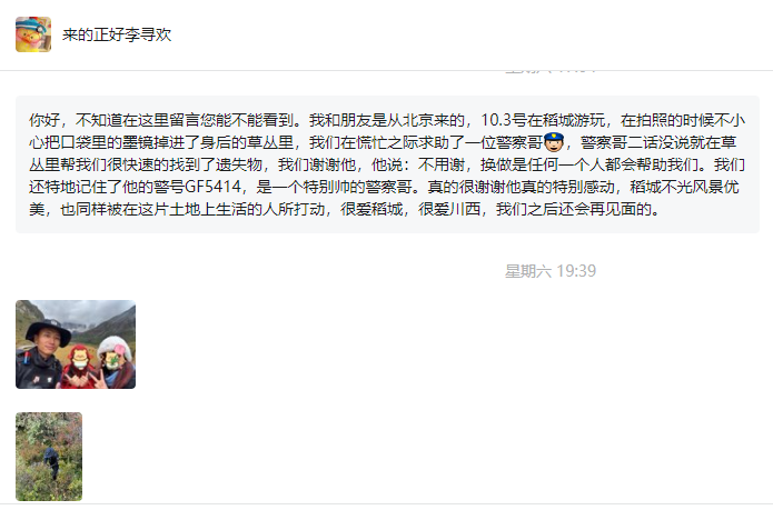 “你好,不知道在這里留言您能不能看到。我和朋友是從北京來(lái)的,10月3號(hào)日在稻城游玩,在拍照的時(shí)候不小心把口袋里的墨鏡掉進(jìn)了身后的草叢里,我們?cè)诨琶χH求助了一位警察哥,警察哥二話沒說(shuō)就在草叢里幫我們很快速的找到了遺失物,我們謝謝他,他說(shuō):不用謝,換做是任何一個(gè)人都會(huì)幫助我們。我們還特地記住了他的警號(hào)GF5414,是一個(gè)特別帥的警察哥。真的很謝謝他真的特別感動(dòng),稻城不光風(fēng)景優(yōu)美,也同樣被在這片土地上生活的人所打動(dòng),很愛稻城,很愛川西,我們之后還會(huì)再見面的?!?/p>