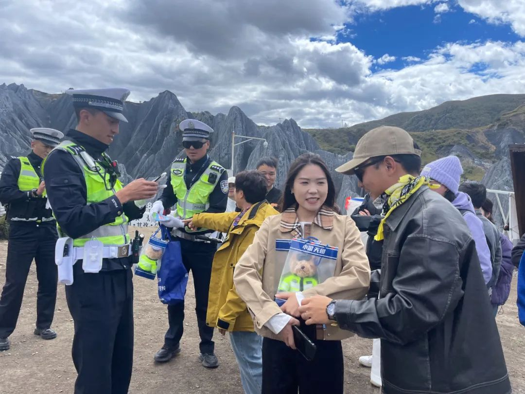 10月1日,在國(guó)慶“黃金周”首日,道孚縣八美鎮(zhèn)墨石公園景區(qū)迎來(lái)了第一批打卡的游客。道孚縣公安局交警大隊(duì)也為遠(yuǎn)道而來(lái)的客人們,準(zhǔn)備了一份精美的小禮品,包含“交警小熊”“水杯”“雨傘”等,游客們只需要回答交警現(xiàn)場(chǎng)開展的“假期平安行·交通安全知識(shí)競(jìng)賽”,答對(duì)題目就能帶著禮品繼續(xù)環(huán)游甘孜。