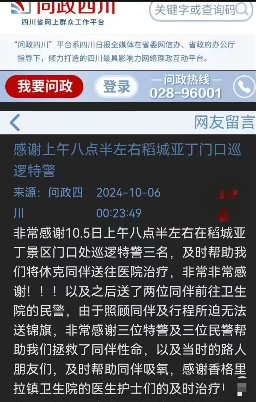 “非常感謝10月5日上午8點(diǎn)半,在亞丁景區(qū)門口的三位特巡警,將我們休克的同伴及時(shí)送往醫(yī)院治療。由于照顧同伴及行程所迫無(wú)法送錦旗,但這份恩情我們永遠(yuǎn)銘記在心!”10月6日,一封來(lái)自游客的感謝信投遞在“問政四川”平臺(tái)上,信中充滿了他對(duì)眾多好心人的感激之情。據(jù)稻城縣公安局特巡警大隊(duì)副大隊(duì)長(zhǎng)四郎澤仁介紹,10月5日,亞丁景區(qū)迎來(lái)眾多游客。我和隊(duì)員們正在景區(qū)門口的執(zhí)勤點(diǎn)位上執(zhí)勤,確保游客的安全和秩序。突然,聽到一陣急促的呼救聲,我們立刻循聲跑去,只見一名女游客倒在地上,身體不停地發(fā)抖,已經(jīng)陷入休克狀態(tài)?!懊鎸?duì)這突如其來(lái)的緊急情況,我們按照日常養(yǎng)成的急救常識(shí),立即對(duì)游客進(jìn)行了初步判斷,根據(jù)其癥狀和表現(xiàn),我們判斷是由于缺氧所導(dǎo)致的,并立即對(duì)她進(jìn)行了初步的搶救?!痹诔醪綋尵群螅撚慰偷那闆r雖有所緩解。于是,我和我的戰(zhàn)友們立即開辟起一條“綠色通道”,用警車將患者轉(zhuǎn)送至鎮(zhèn)衛(wèi)生院。為了不浪費(fèi)任何一分鐘的治療時(shí)間,到達(dá)衛(wèi)生院后特巡警隊(duì)員將患者背上,送入診療室。當(dāng)看到游客在醫(yī)生的救治下逐漸恢復(fù)意識(shí),我們懸著的心也終于放了下來(lái)。那一刻,我們深深地感受到了作為一名警察的責(zé)任和使命。