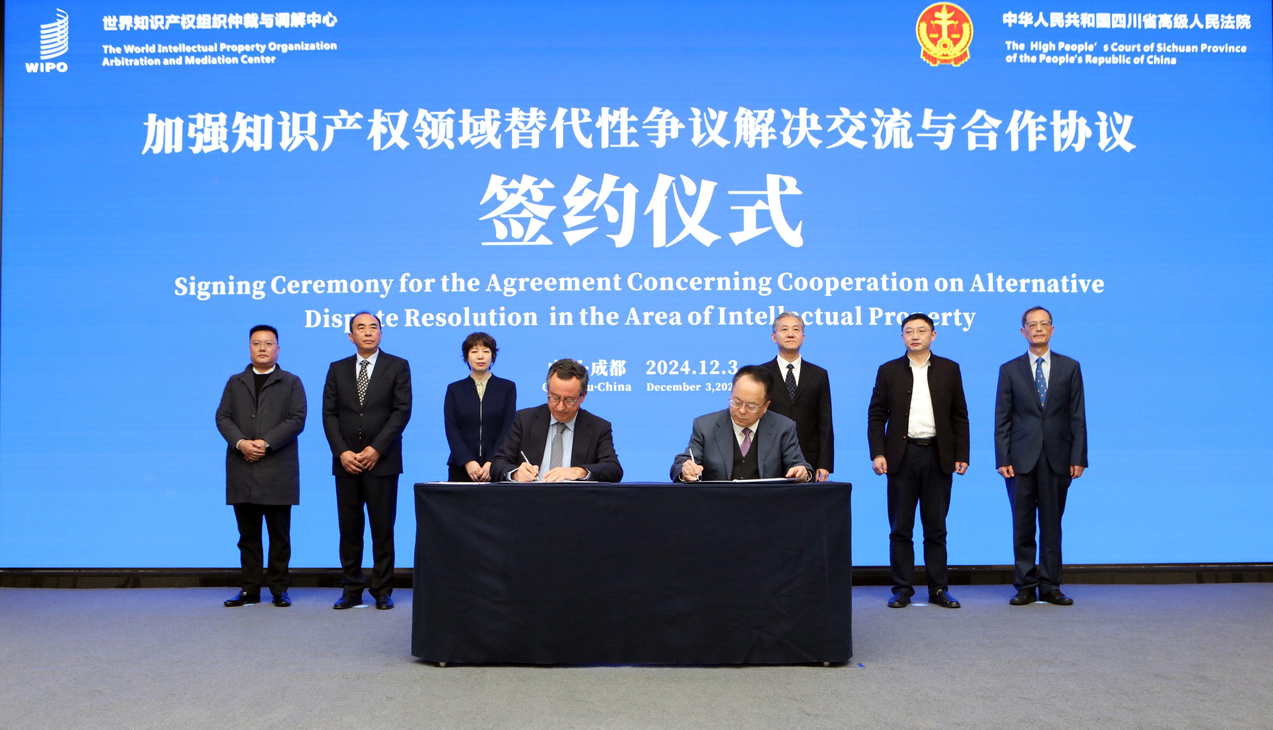 12月3日,四川高院黨組書記、院長王樹江與世界知識產(chǎn)權(quán)組織仲裁與調(diào)解中心司長伊格納西奧·德·卡斯特羅正式簽署《加強(qiáng)知識產(chǎn)權(quán)領(lǐng)域替代性爭議解決交流與合作協(xié)議》,這是四川高院為企業(yè)提供更加高效、便捷的糾紛化解機(jī)制的重要舉措。基于此,在最高人民法院的支持下,四川高院與世界知識產(chǎn)權(quán)組織仲裁與調(diào)解中心進(jìn)行了近一年的磋商,最終成功簽署合作協(xié)議。
