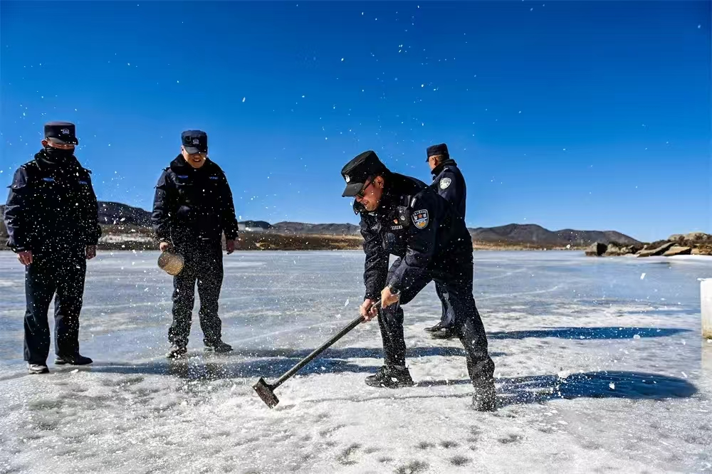 中午時(shí)分,土登郎加又和大家一起前往警務(wù)站不遠(yuǎn)處的措拉湖里取水,警務(wù)站不通水,大家的生活用水都是從這個(gè)海子里提取的。每到冬季,海子的水面就會(huì)結(jié)冰,堅(jiān)固的冰面能夠通行汽車(chē)。只有到了中午,氣溫開(kāi)始回升,冰層融化了一些,大家找到結(jié)冰薄一點(diǎn)的地方,使勁用鐵錘鑿開(kāi)一個(gè)窟窿,才能取到冰面下的水。