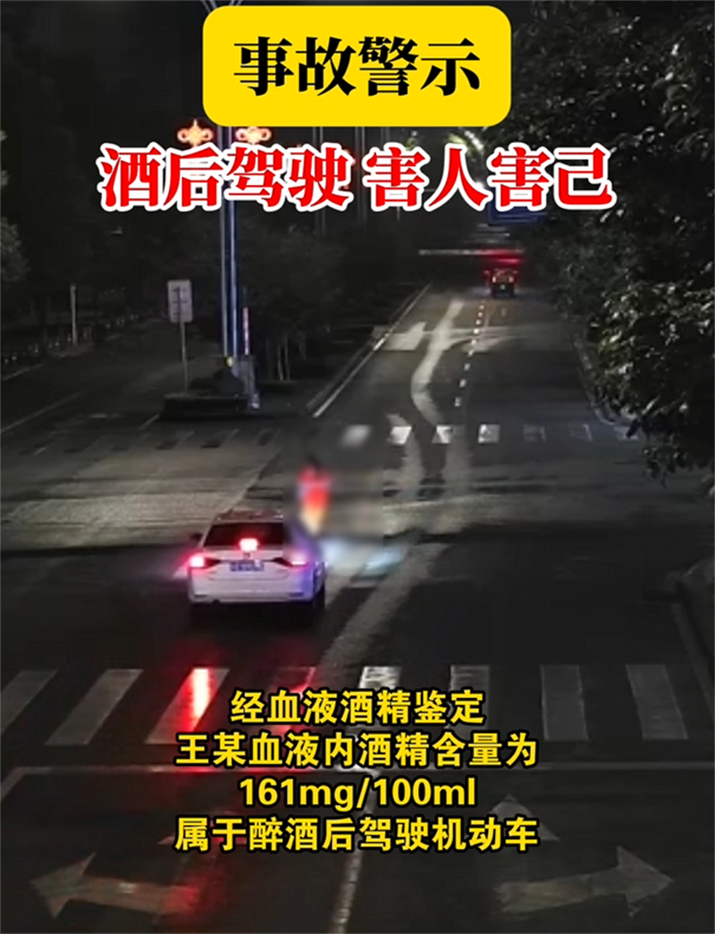 接到報(bào)警后,樂山市夾江縣公安局交通管理大隊(duì)事故中隊(duì)民警迅速趕往現(xiàn)場(chǎng)處置,發(fā)現(xiàn)駕駛?cè)送跄成嫦泳坪篑{駛機(jī)動(dòng)車,并依法將王某帶至醫(yī)院提取血樣。經(jīng)鑒定,王某血液內(nèi)酒精含量為161mg/100ml。王某因犯危險(xiǎn)駕駛罪,被夾江縣人民法院依法判處拘役2個(gè)月,緩刑3個(gè)月,并處罰金3000元。同時(shí),公安機(jī)關(guān)交通管理部門依法對(duì)王某做出吊銷機(jī)動(dòng)車駕駛證,五年內(nèi)不得重新取得機(jī)動(dòng)車駕駛證的行政處罰。