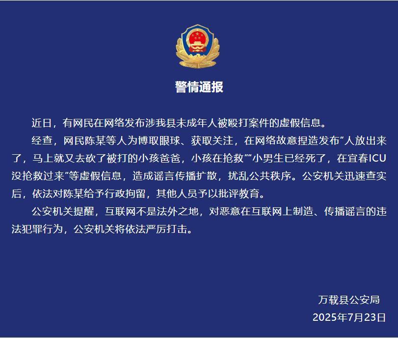 7月23日下午,萬載縣公安局發(fā)布警情通報(bào)稱,網(wǎng)民陳某等人為博取眼球、獲取關(guān)注,在網(wǎng)絡(luò)故意捏造發(fā)布“小男生已經(jīng)死了,在宜春ICU沒搶救過來”等虛假信息,公安機(jī)關(guān)依法對陳某給予行政拘留,其他人員予以批評教育。