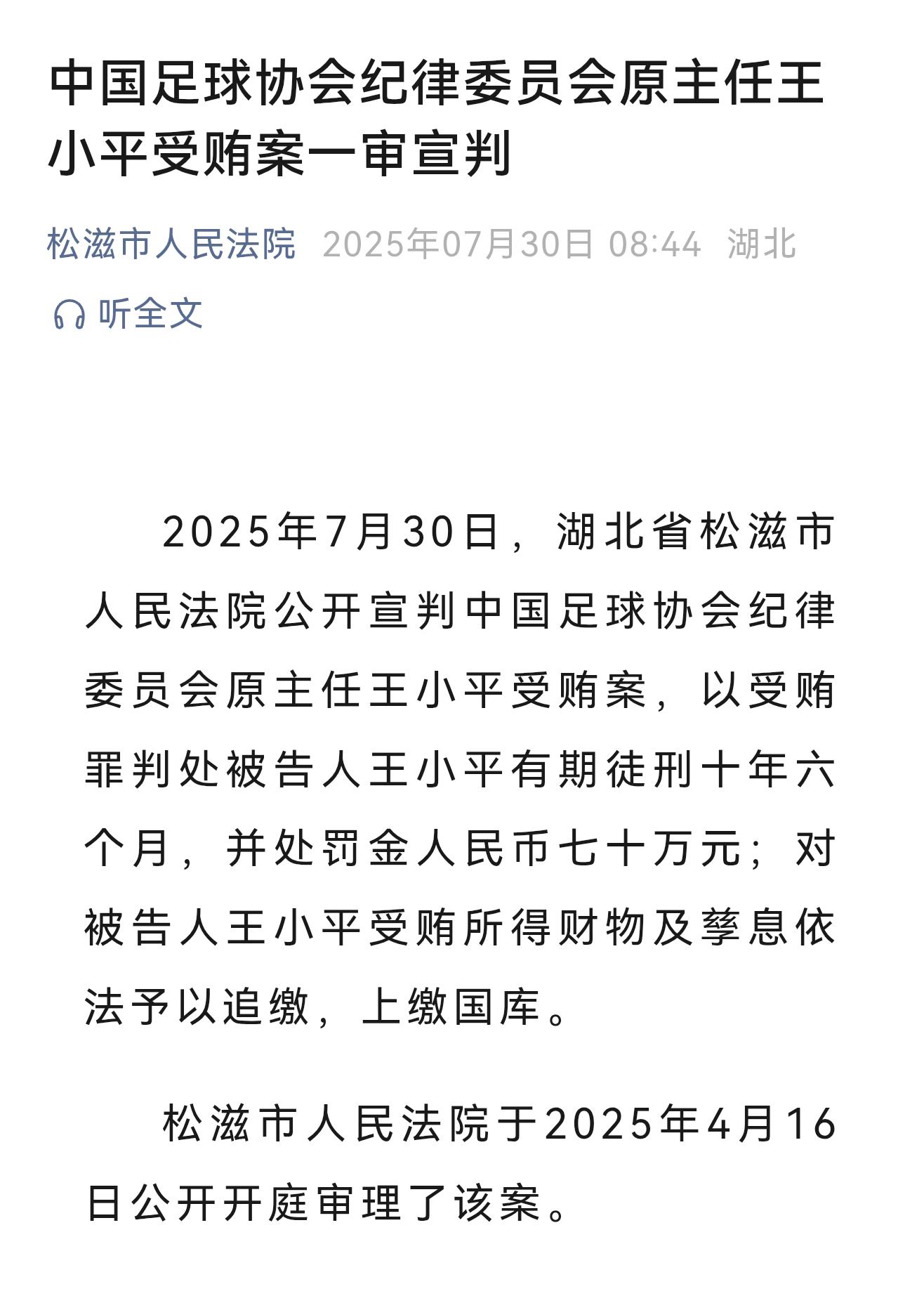 7月30日上午,湖北省荊州市松滋市人民法院、咸寧市通山縣人民法院分別對(duì)中國(guó)足球協(xié)會(huì)紀(jì)律委員會(huì)原主任王小平受賄案及中超聯(lián)賽有限責(zé)任公司原董事長(zhǎng)劉軍受賄、非國(guó)家工作人員受賄案進(jìn)行公開宣判。